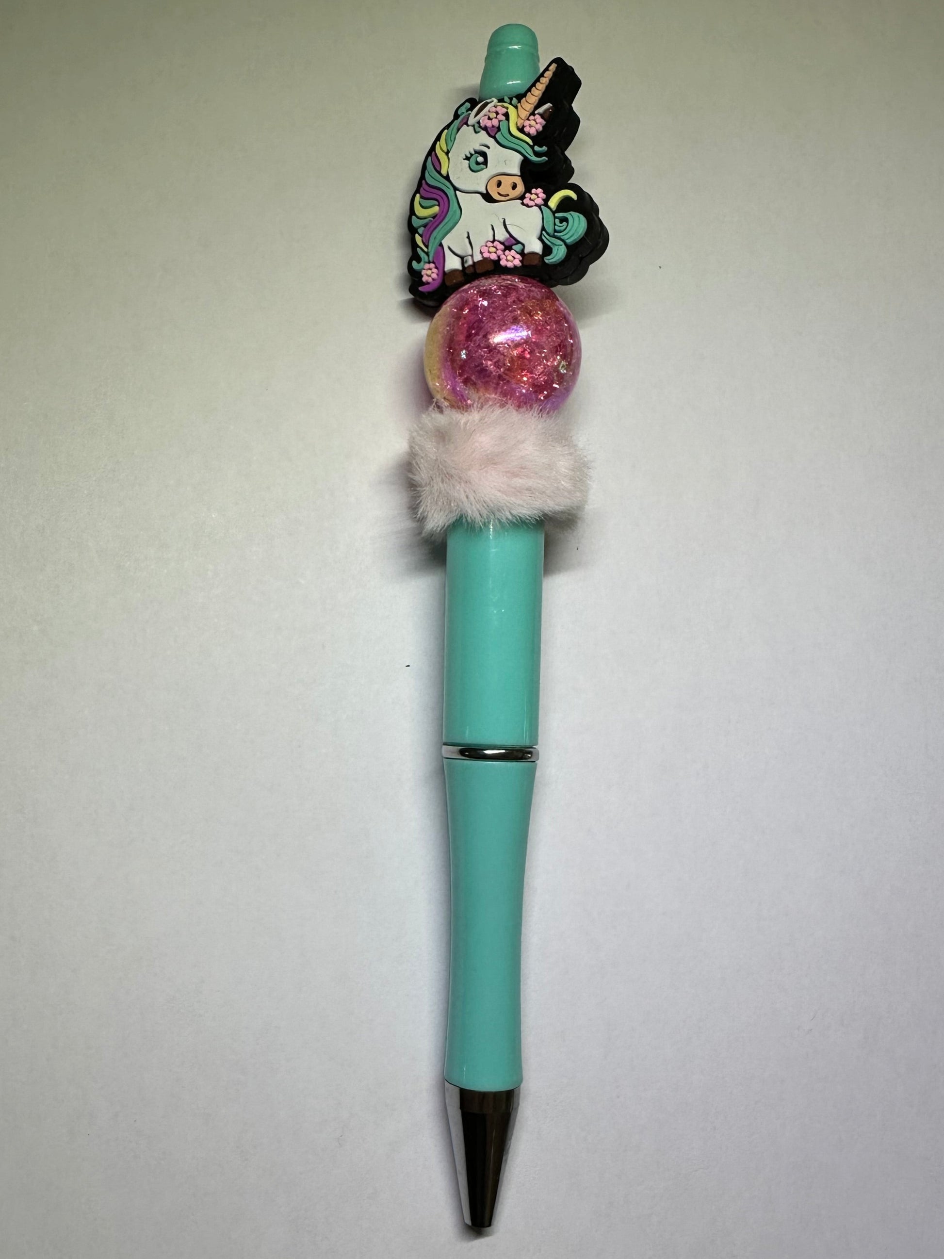 Handmade pen. Teal pen with pastel unicorn and sparkly pink bead. This pen features a lovely white "fluff" to add to the design